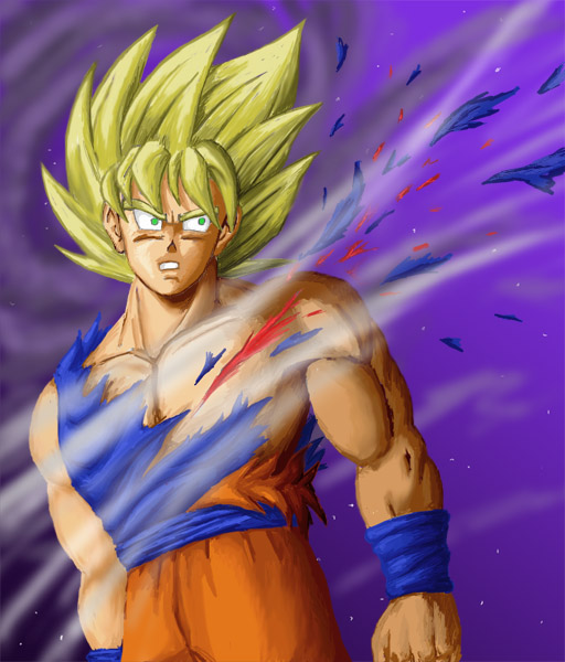 | I drew a sketch of Gokuu and decided it looked too plain, so I ended up trying out a different style... I'm not too happy with it, so I probably won't be doing this again for a while. Realistic style just doesn't work with DBZ; the eyes and hair just don't work. It's just fun to play around with every once in a while. ^_^ |