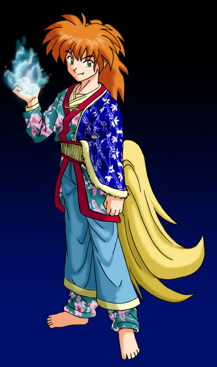 | I don't generally do much fanart from other series, but I really wanted to do this one for some reason... This my impression of a grown-up Shippo-chan, from Inuyasha, one of my other favorite series. I tried out some morphing techniques for the patterned cloth, see how it sort of wraps around? The patterns were originally only black and white, so I had to change the colour settings and so on. ^_^; To put it simply, this one took a lot of work for a simple portrait. |