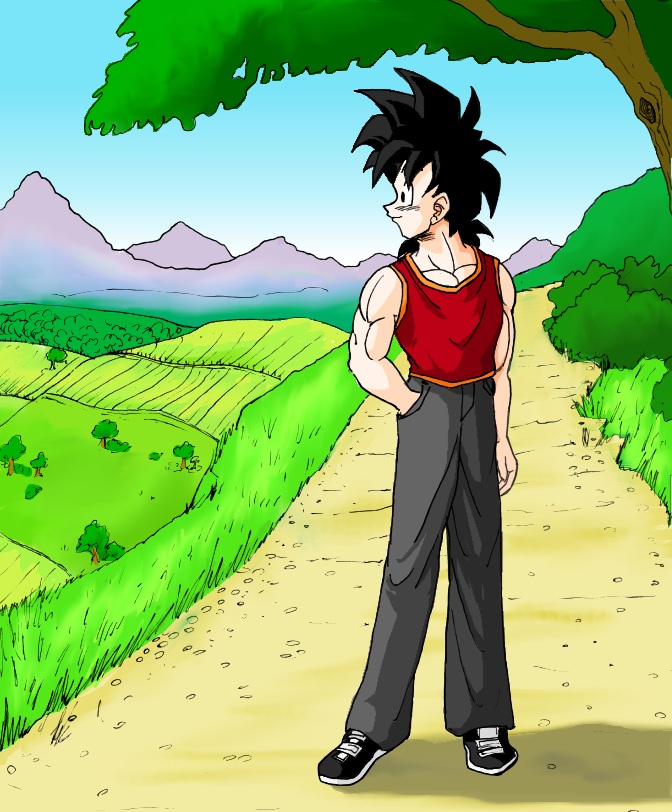 | This picture really expresses how I felt when I was drawing it. I really wanted to do something colourful and bright, (^_^ I guess you could say I was in a good mood... that or on something). I love drawing Goten aged 17, but I rarely draw pictures that I feel are worth scanning and colouring, so I really like this one. It took something like four layers, and four hours all up, but I think it was worth it. See? It's special, it gets a comment. |