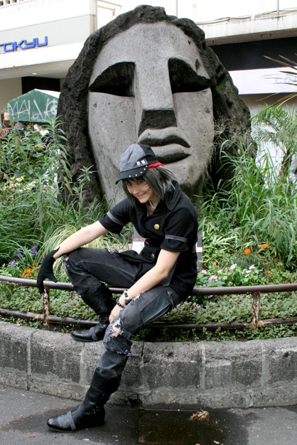 The glove was one thing that gave me a lot of trouble, trying to think of a way of doing it that wouldn't involve body paint. In the end, I used a matt black glove, with the edges cut, attatched to my arm with sock glue. Sock glue? It's a type of skin-safe glue that was popular in Japan in the 90's in order to hold 'loose socks' in place. Shasta happened to have some from one of her Japan trips. It works brilliantly!
